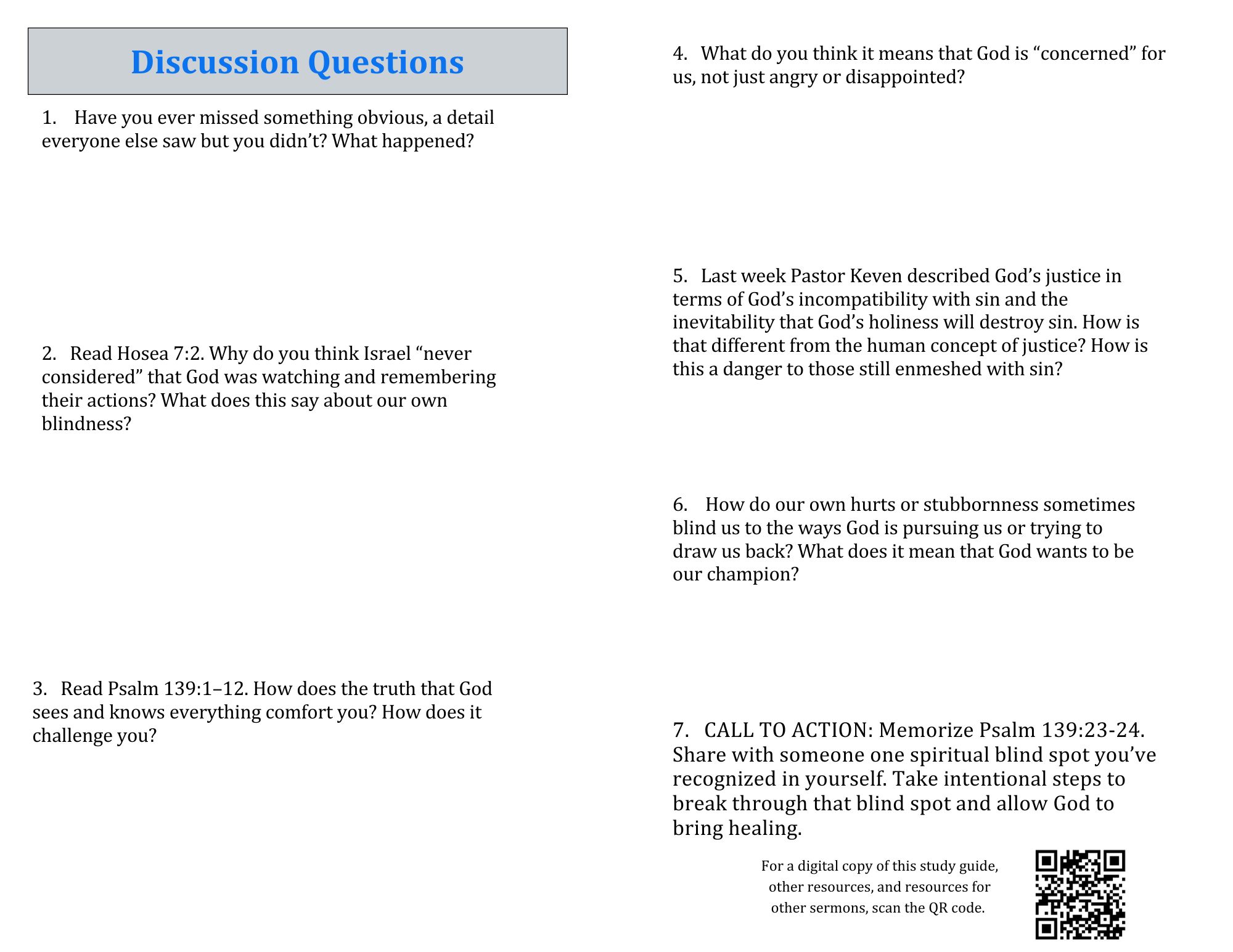 7. CALL TO ACTION: Memorize Psalm 139:23-24. Share with someone one spiritual blind spot you’ve recognized in yourself. Take intentional steps to break through that blind spot and allow God to bring healing.