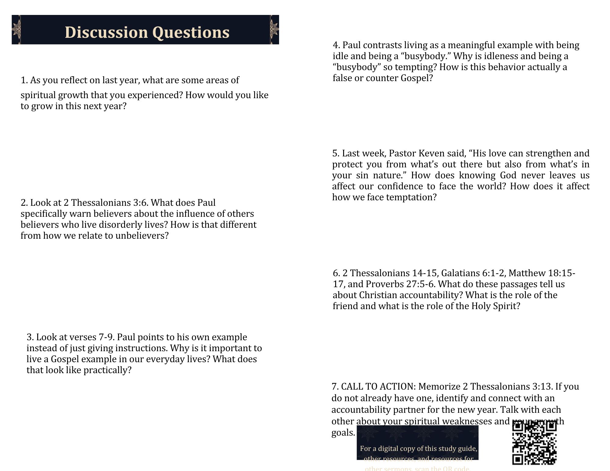 7. CALL TO ACTION: Memorize 2 Thessalonians 3:13. If you do not already have one, identify and connect with an accountability partner for the new year. Talk with each other about your spiritual weaknesses and your growth goals.