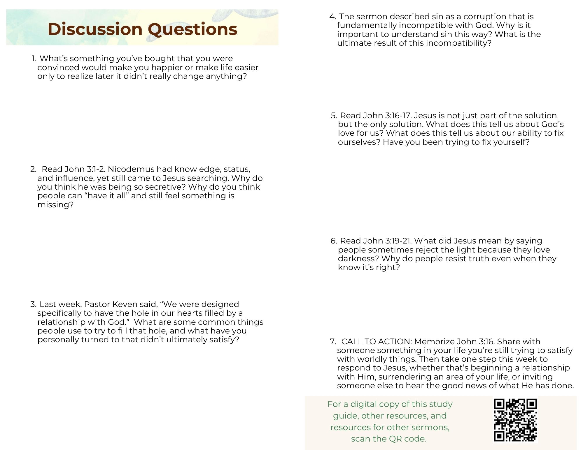 7. CALL TO ACTION: Memorize John 3:16. Share with someone something in your life you’re still trying to satisfy with worldly things. Then take one step this week to respond to Jesus, whether that’s beginning a relationship with Him, surrendering an area of your life, or inviting someone else to hear the good news of what He has done.