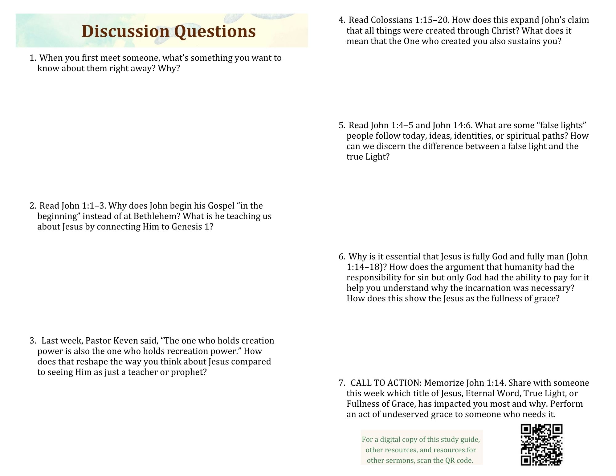4. Read Colossians 1:15–20. How does this expand John’s claim that all things were created through Christ? What does it mean that the One who created you also sustains you?